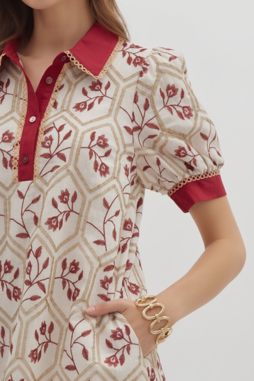 Throw it on and go. Cute floral embroidered short sleeve mini with V neck collar