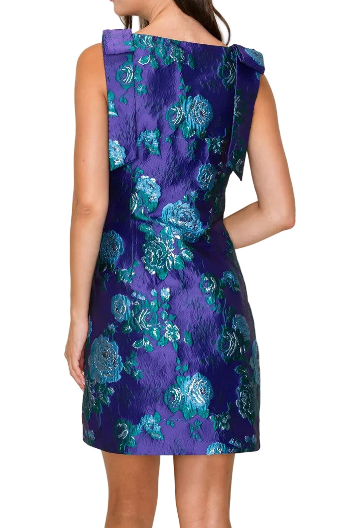 Streamlined jacquard dress with bow detail at shoulder, size zip closure in a rich jewel purple